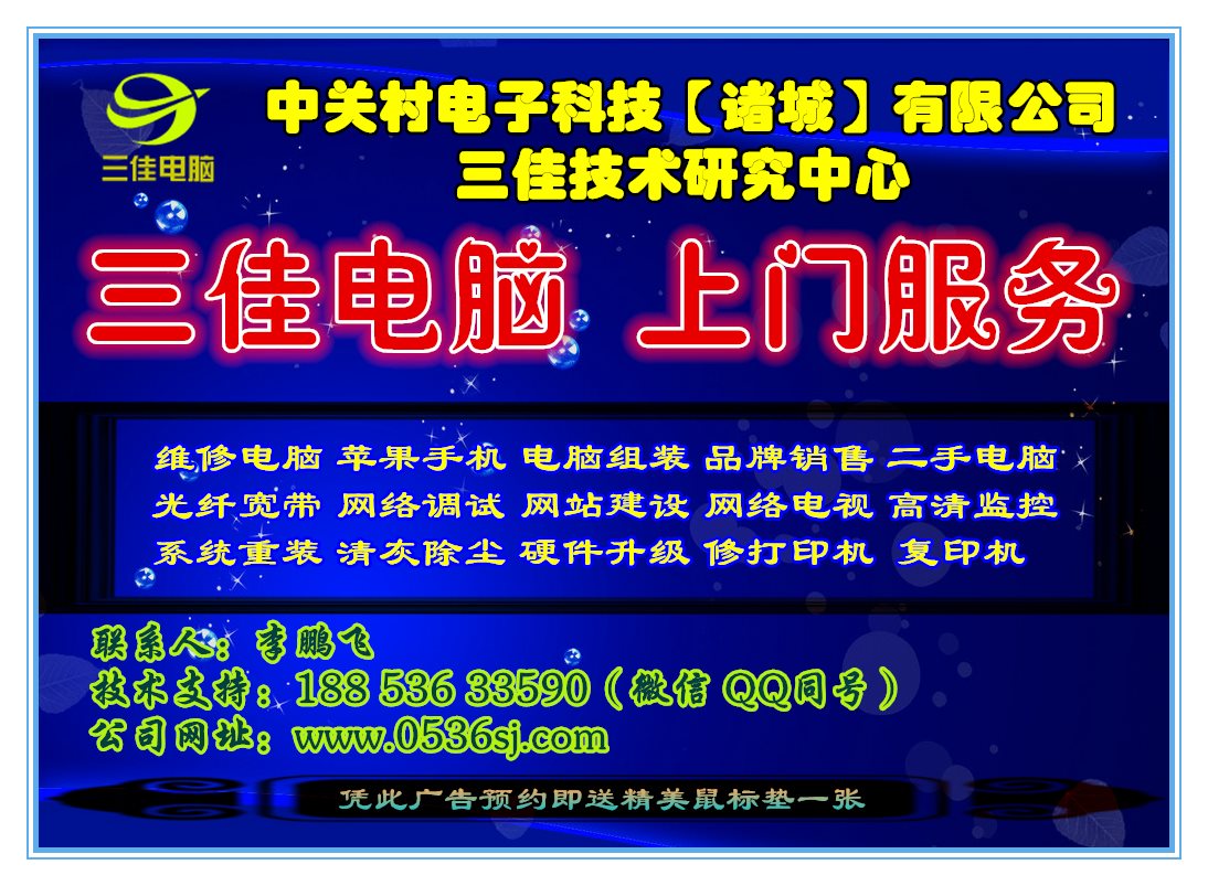 诸城专业上门电脑维修来电一分钟出门 我们承诺修不好不收费,半小时上门服务 可提供正规发票 联系人:李鹏飞 电话:18853633590